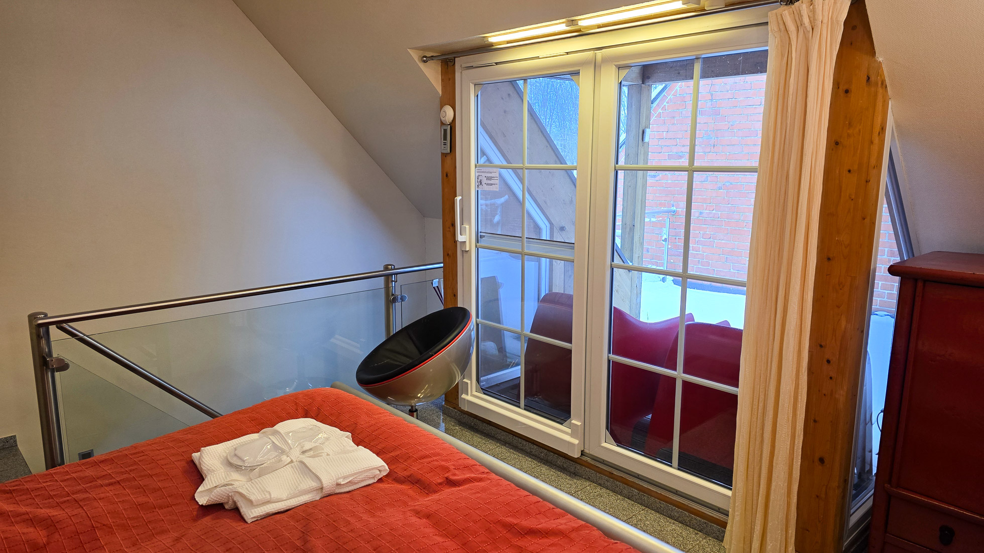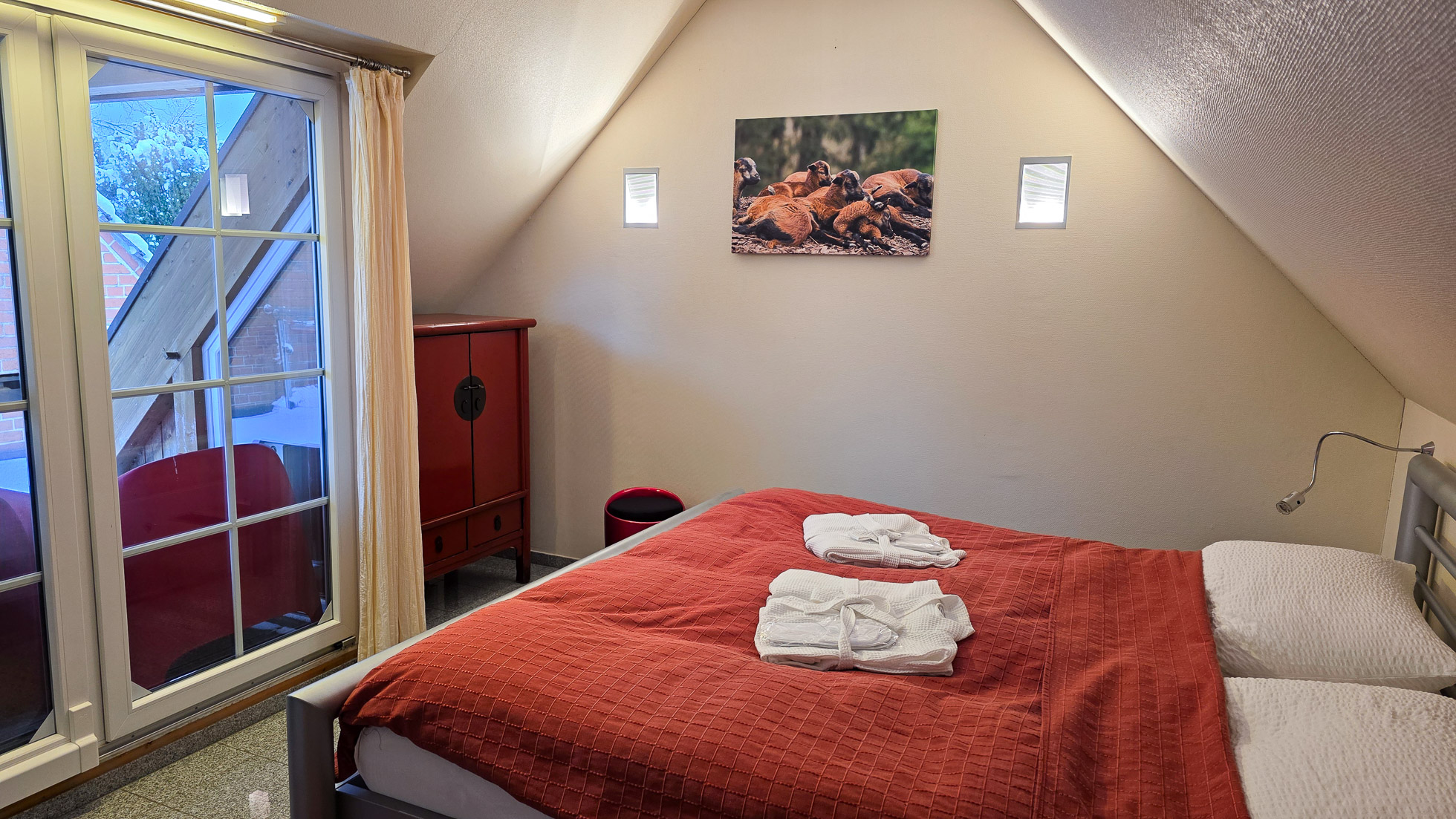 Im Obergeschoss befindet sich das ruhig gelegene Schlafzimmer mit Doppelbett.